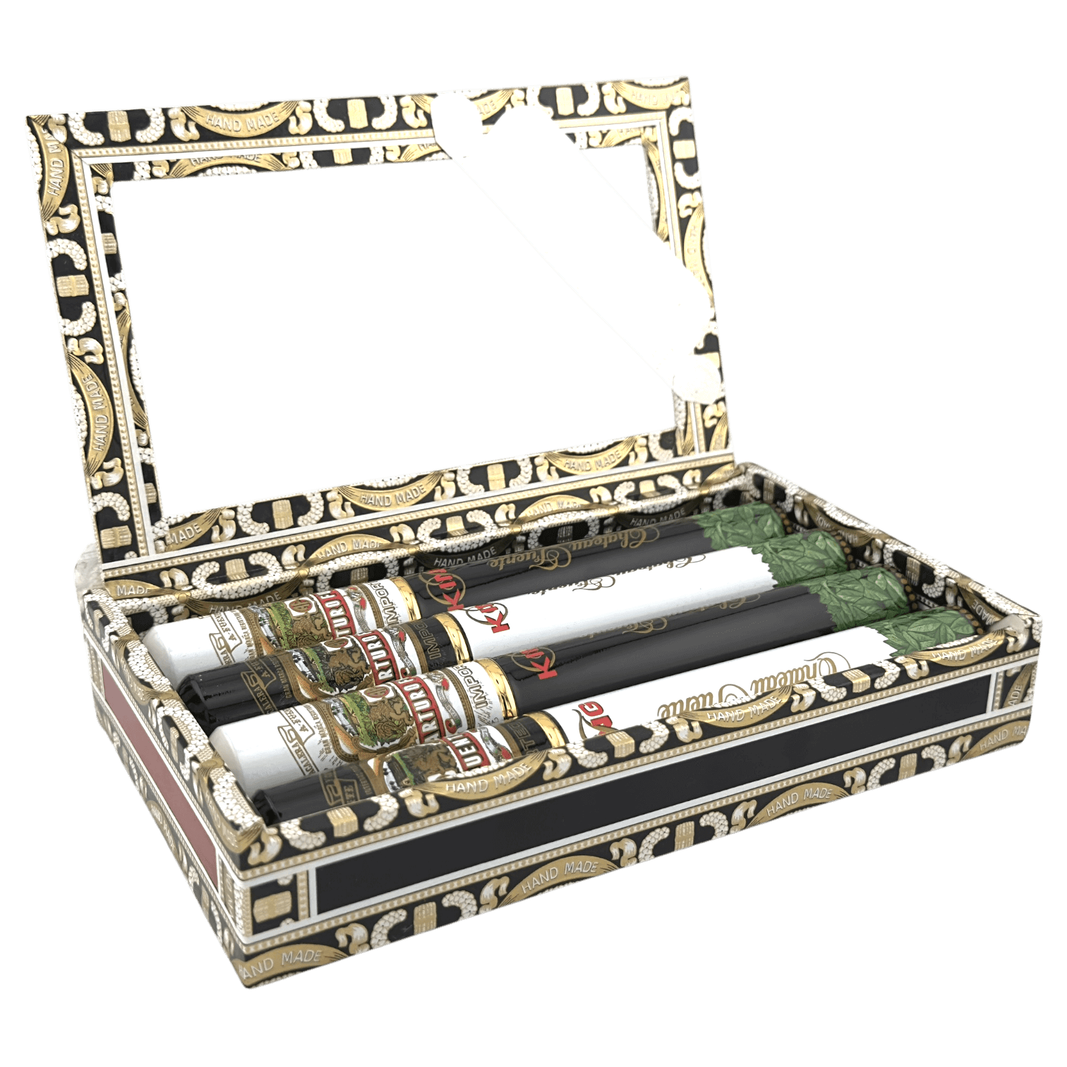 Each leaf is selected from a private reserve set aside exclusively for the making of these cigars. These fine tobaccos are internationally recognized for their superiority. Arturo Fuente Gran Reserva cigars are then skillfully rolled with African Cameroon, Connecticut shade or Ecuadorian sungrown wrappers. Taking absolutely no shortcuts, every step of the cigar making process is done completely by hand, to ensure a finished cigar without parallel. The cigars are then aged in Spanish cedar vaults to the peak of perfection to create a marriage of the blends producing an excellent “individualistic” heavyweight cigar to be counted among the world’s finest.